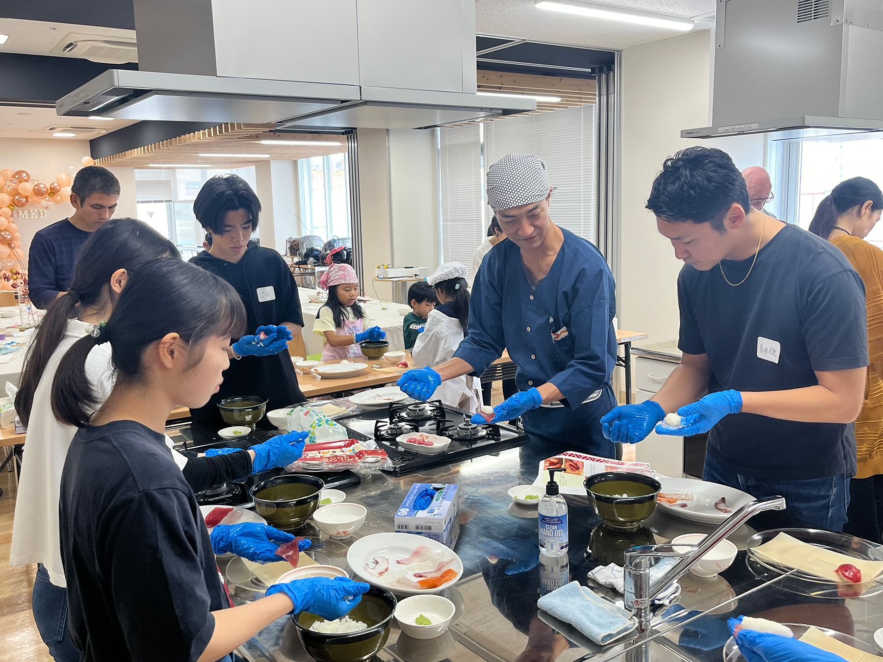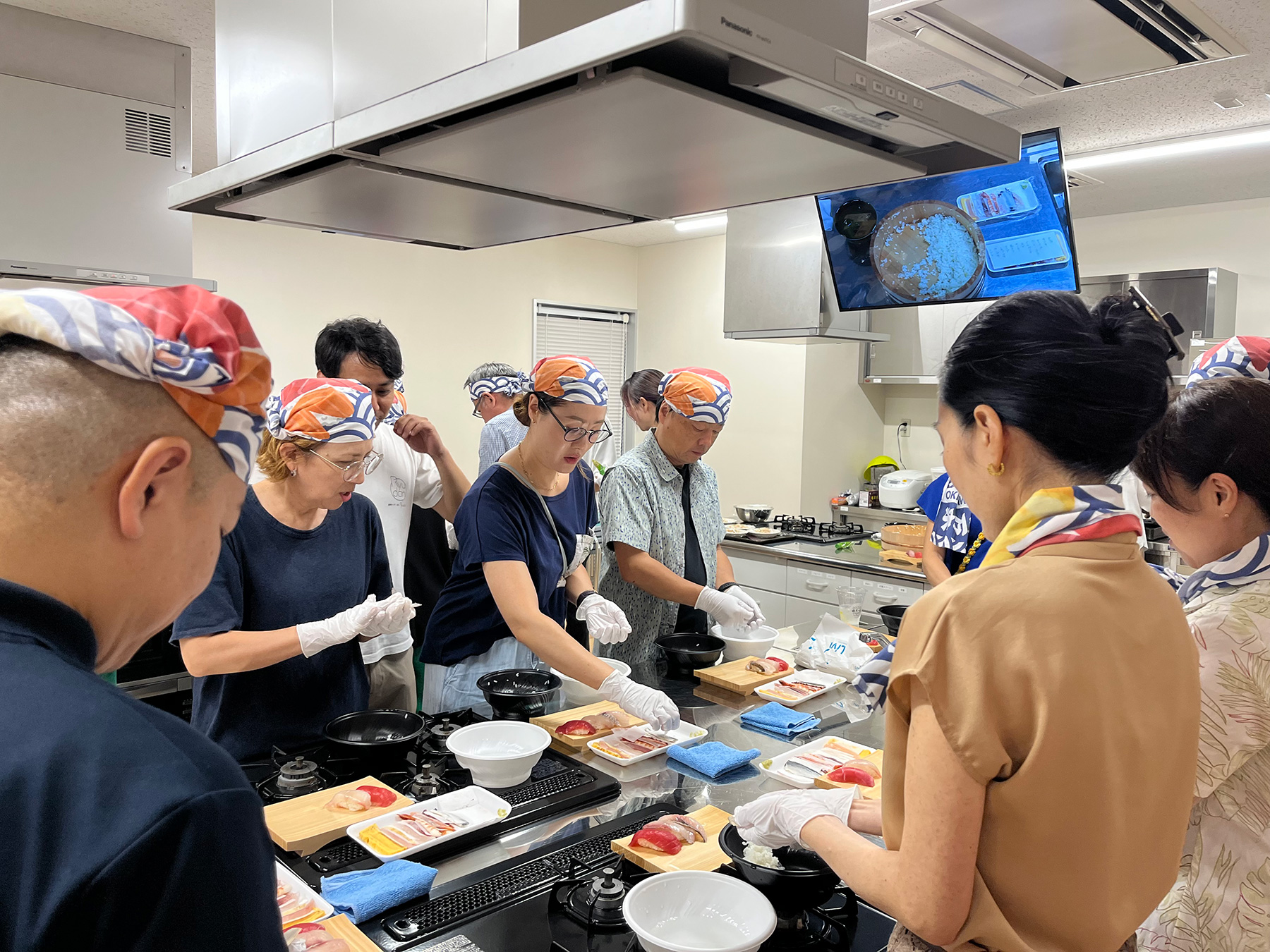 与那城漁業協同組合にて、獲れたて魚市場のセリ見学(土曜日のみ)と魚捌きパフォーマンスの見学、捌いた魚でプロの寿司職人による寿司握り教室。